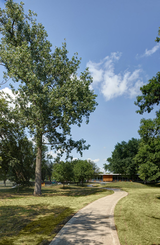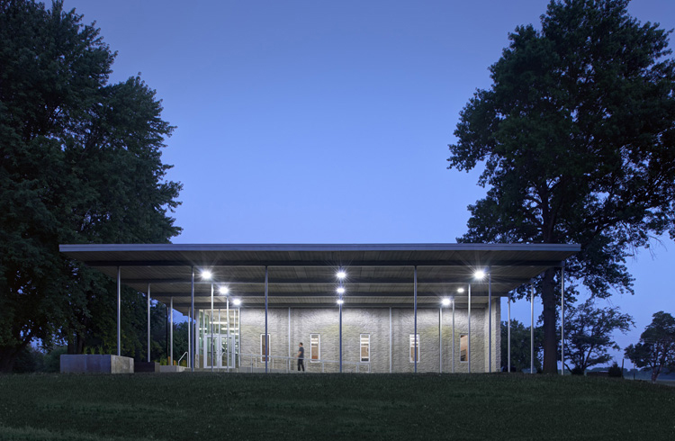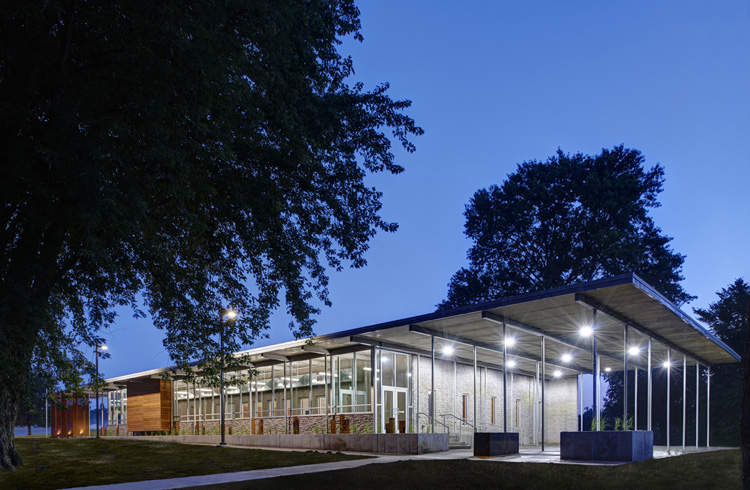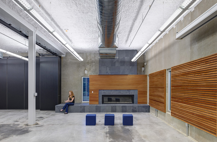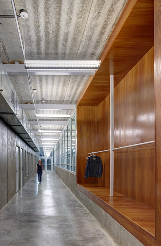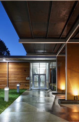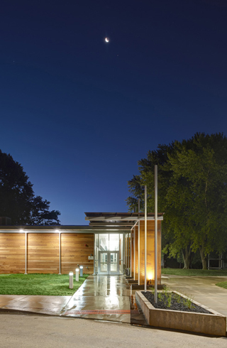 Upon approach, steel columns create a rhythm that then support a covered entry and align with the structure of the building. The landscaped area adjacent to the entry helps to frame the path to the building while also creating a contrast to the strong, clean lines of the simple building. The building, made of precast concrete panels, steel, and wood siding, has a low, rectangular silhouette to enable it to flow with the surrounding landscape.