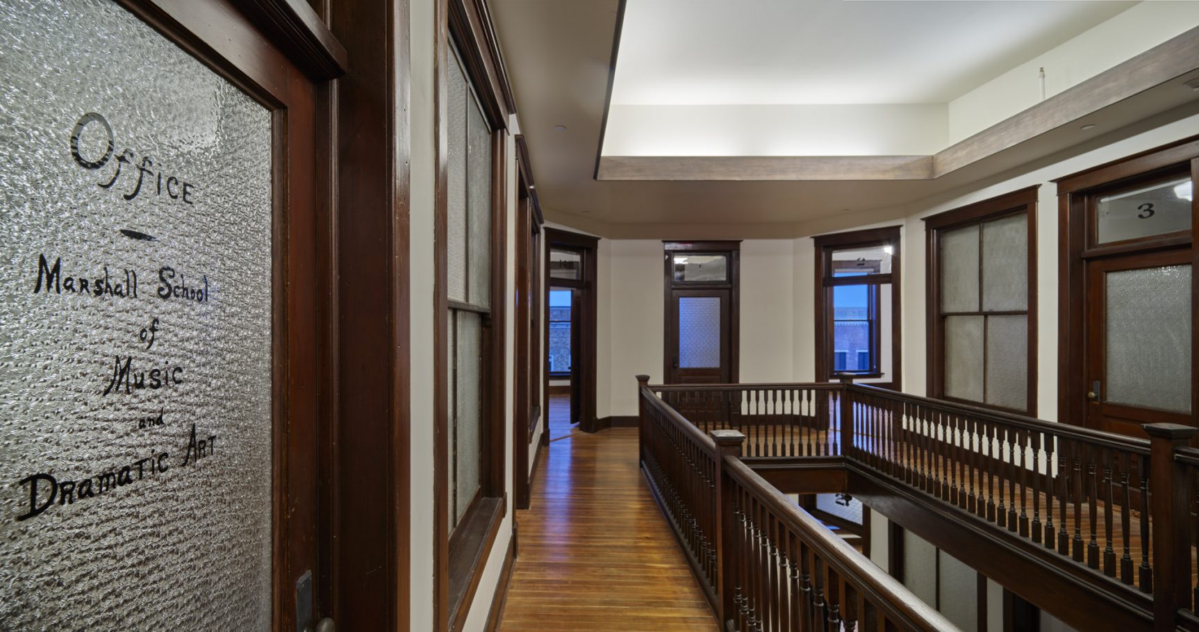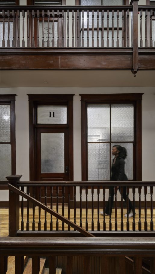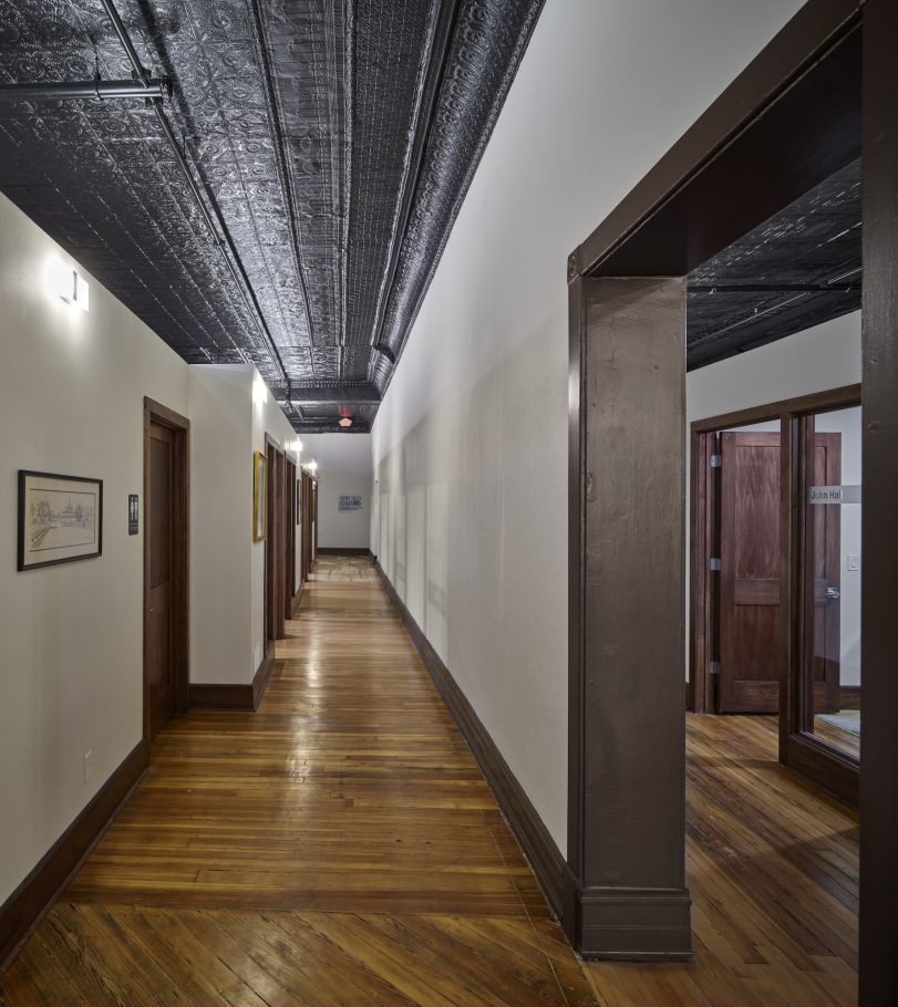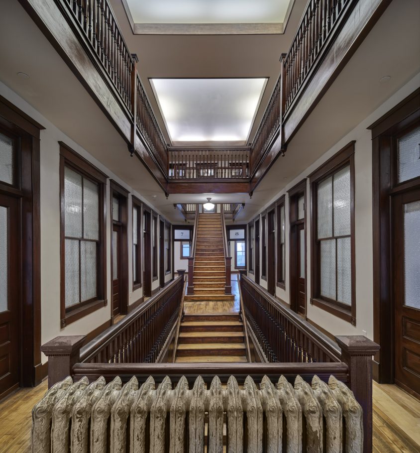 The building now has 13 residences and two commercial spaces. The stair-atrium of the Hopkins is the figurative and literal center piece of the interior. It has been restored to appear unchanged from over a century ago. Even the hand painted signage on the doors remains. The facades have been restored, life safety resolved, and the building is fully accessible.